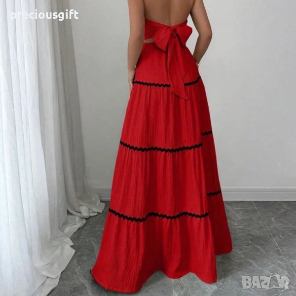 Дамски комплект - дълга пола и топ без презрамки, наличен в бежово, черено, червено, синьо, жълто → Обява 51367930