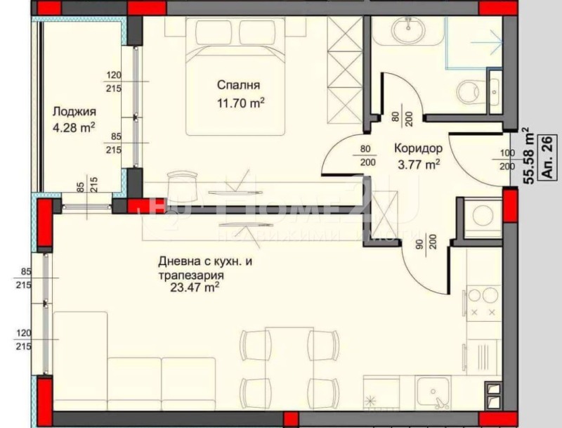 Имотът е разположен върху площ от 65 квадратни метра и е със следното разпределение: