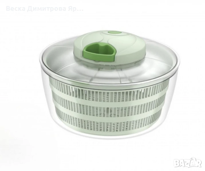 Размери: Центрофугата за салата: Ø24.5х15.5см – 4л; Ръчен чопър: Ø14х9см – 650мл; Материал: Неръждаема стомана, PS, PP, HDPE, TPR, ABS; Комплектът съдържа: Купа - 4 литра, кошница, капак, капак с въже, чопър купа антислип дъно ≈0.65л., чопър капак за съхранение, приставка за рязане с 3 ножа от неръждаема стомана; Система за издърпване за активиране на функциите за центрофугиране и нарязване. Енергийно ефективен уред за сушене и нарязване на съставки по време на приготвяне на храна. Остриетата са изключително остри – бъдете внимателни и дръжте далеч от деца. Приставката с ножове може да се използва за рязане на плодове, зеленчуци, подправки, ядки, бисквити и др. Неплъзгащото се краче трябва да се отстранява при миене в съдомиялна машина. Цвят: Зелен.