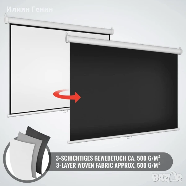 ⭐⭐⭐⭐⭐ ПРАКТИЧНО: Прибиращ се екран - нашият външен филмов екран е напълно прибиращ се с механизъм за автоматично навиване. Трислойната структура от 400/500 g/m² и черната рамка осигуряват по-добър контраст и максимално качество.