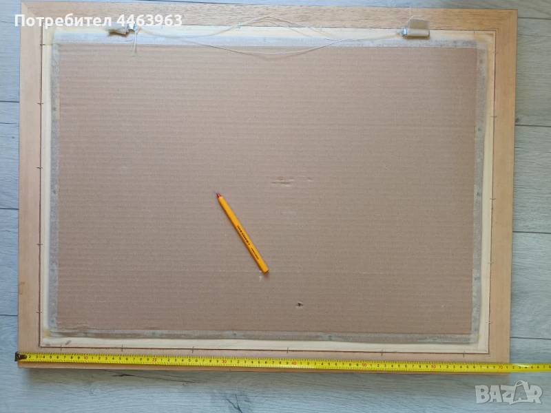 Крайният размер с рамката е 71/52 см. Рамката е дървена, широка 4 см. Паспартуто е широко 2 см,.( общо 6 см)