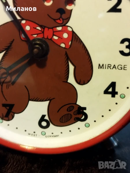 Стар немски анимиран механичен будилник Mirage Работи и звъни, в отлично за годините състояние.Диаметър-72 милиметра.Номер на часовника 934921