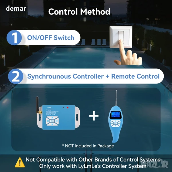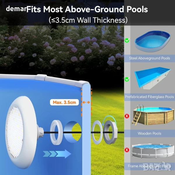 Тази лампа за басейн е с 5 см стандартна външна резба с уплътнение и контрагайка за лесен ръчен монтаж, идеална за тънки или стоманени басейни с дебелина под 3,5 см. Разглобяемият кабел с бързосъединяваща конструкция позволява тялото на лампата да се отстрани от задното закрепване за лесна поддръжка или подмяна без електротехник. Работи безопасно с ниско напрежение 12V AC и изисква 12V трансформатор за монтаж (не е включен). Пакетът включва една лампа без контролен блок, като е възможно превключване на цветовете чрез стандартен превключвател.