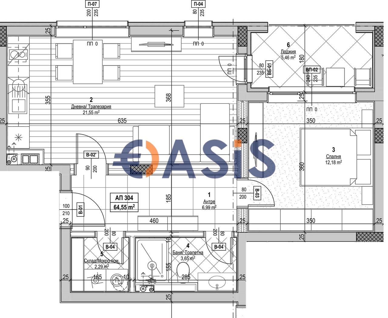 Големината на антрето е 7.58 кв. м., трапезарията и дневната са в общо помещение с площ от 21.44 кв. м. Спалнята е с площ от 12.64 кв. м., банята и тоалетната са в едно свързано помещение от 3.61 кв. м. Апартаментът притежава и склад с площ от 2.23 кв. м., балконът е с площ от 4.96 кв. м.