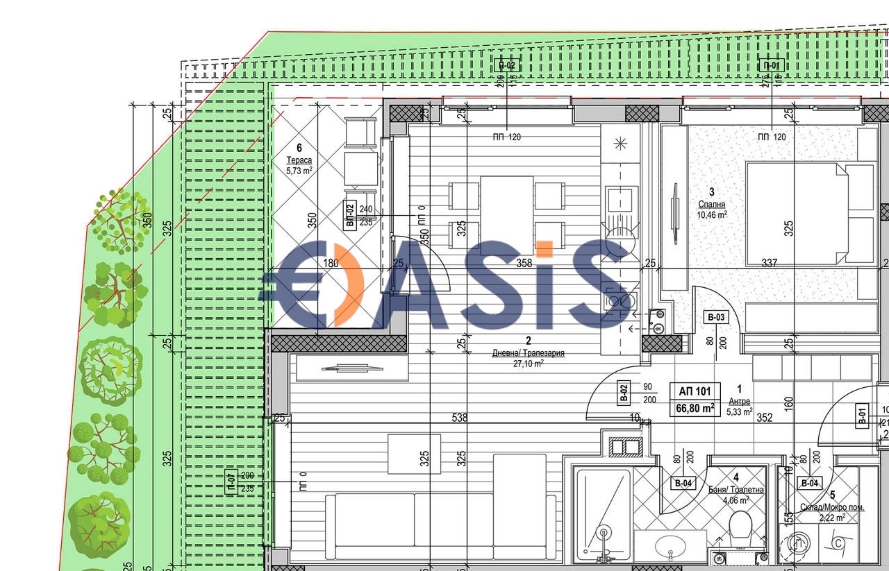 Апартаментa се намира на първият етаж на сградата и е с гледка към морето. Този апартамент притежава прилежащ собствен двор, което на практика го доближава до къща. Чистата площ на апартамента е 66.8 кв.м. Общата му площ е 77.14 кв.м. Общите му части са 10.34 кв.м.