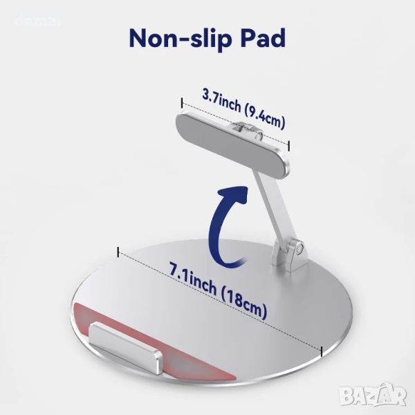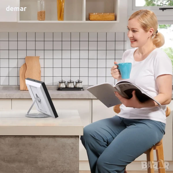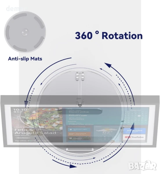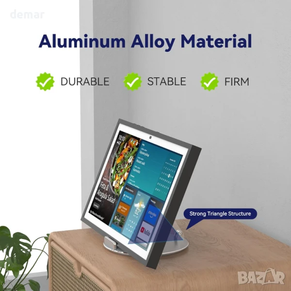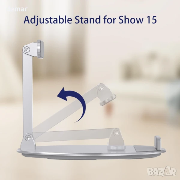 Изработена от висококачествен сребрист алуминий с анодизирано, устойчиво на надраскване покритие, тази въртяща се стойка с възможност за накланяне предлага въртене на 360°, регулируем наклон от 20° до 85° и сигурно, безклатещо се захващане за Show 15/21, iPad и таблети. Адаптивността ѝ към плоска повърхност я прави подходяща за кухни, дневни или офиси, а пет неплъзгащи се гумени подложки осигуряват стабилност върху стъкло, дърво или мрамор. Проектирана за комфорт, тя помага за намаляване на напрежението във врата и очите по време на дейности като видео разговори, четене на рецепти или стрийминг. Издръжлива, устойчива на ръжда и корозия, тя съчетава модерен стил с надеждна функционалност за ежедневна употреба във всяко пространство.