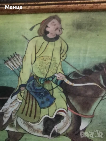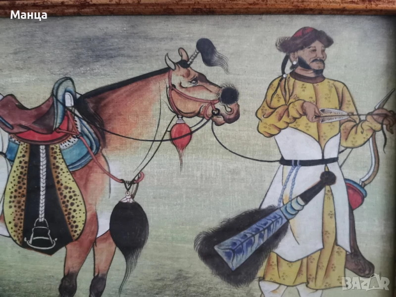 Два броя картини, старинна тематика, изобразяваща конник в традиционно облекло. Произведението е традиционна азиатска живопис, вероятно акварел,с характерни дитайли в облеклото и снаряжението на конника.В горния десен ъгъл има авторски подпис и печат. Картините са с луксозна дървена рамка и светло отразително стъкло. Размери 32/21 см. с рамката. Цената е за един брой и е крайна.