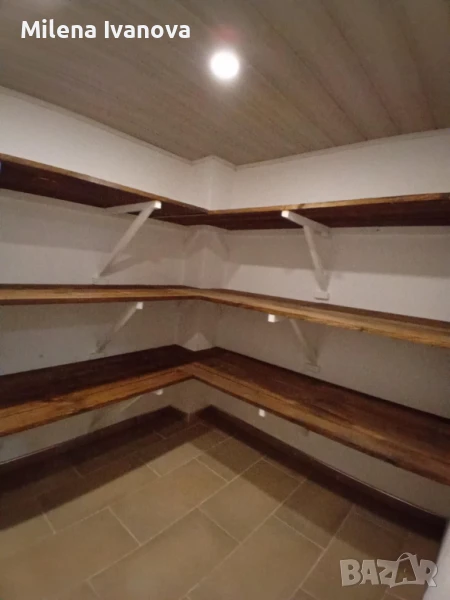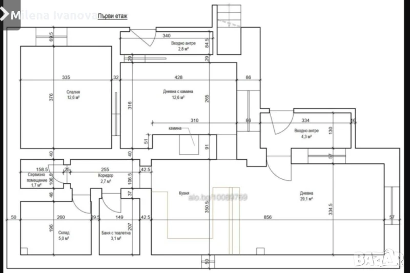 1-ви етаж (73,2 м²): хол, кухня, камина, спалня, баня, складово помещение.