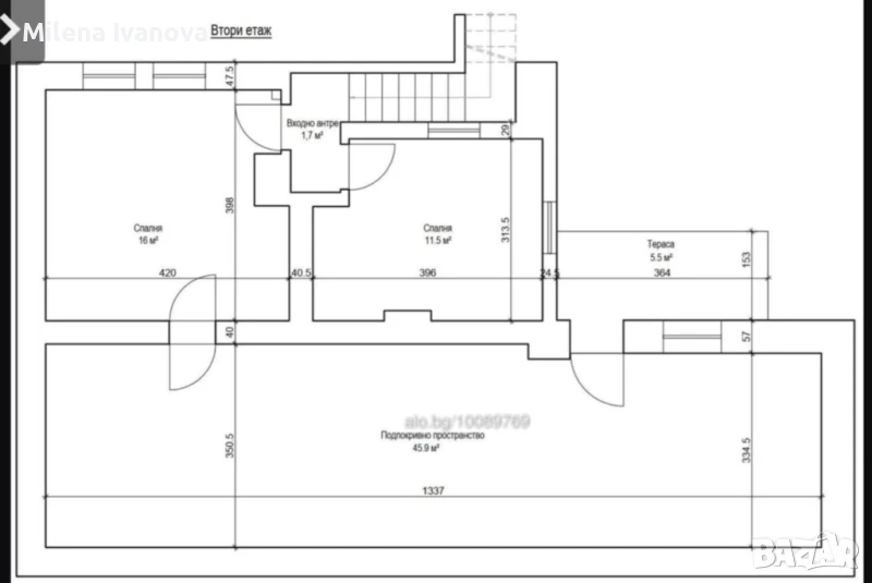 2-ри етаж (34,7 м²): 2 спални, тераса; коридор (45,9 м²).
