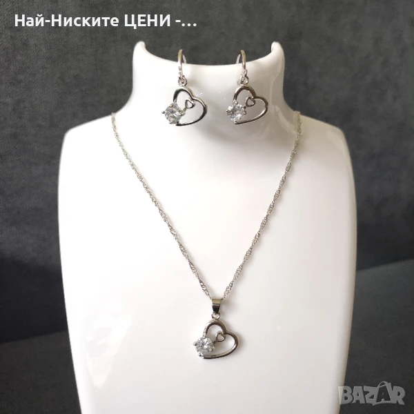 Изненадай себе си или любим човек с този елегантен комплект – колие и обеци във формата на сърце с блестящ камък 💎