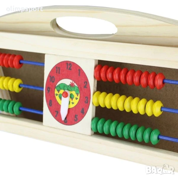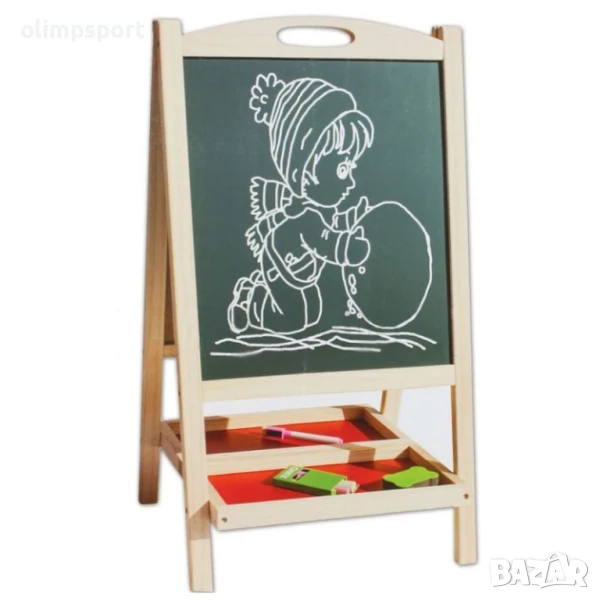 Детска дървена дъска за писане, рисуване и смятане, стояща, с 55 броя букви на кирилица. Включени са всички букви от българската азбука, като от по-често употребяваните са включени по няколко, за да може да се съставят по-сложни думи. Бяла страна за писане и рисуване с маркер и зелена - за тебешир; магнитна и от двете страни. От страната на бялата дъска има сметало с 60 цветни топчета, групирани по 10, и обучителен часовник. В комплекта са включени гъба, маркер и кутия цветни тебешири. Пространството за писане на бялата дъска е 39х36 см, а на зелената - 39х47 см. Дъската е сгъваема и има дръжка за удобство при пренасяне. Размери кутия - 92х46х6 см. Заемана площ - 44х41 см. Височина - 88 см. Размери бяла дъска - 39х36 см. Размери зелена дъска - 39х47 см. Материал - дървесина, PVC. Тегло нето - 2.7 кг. Тегло бруто - 3.4 кг. Брой бувки - 55.