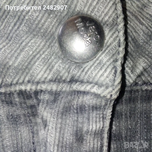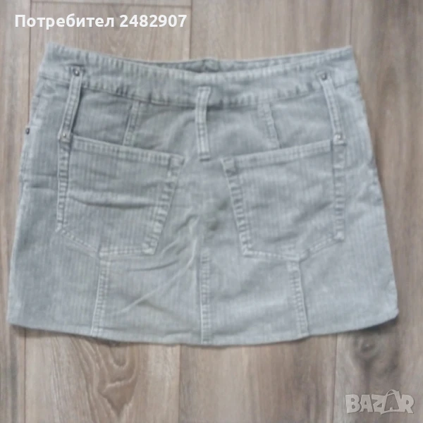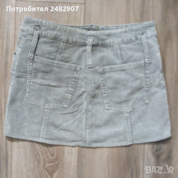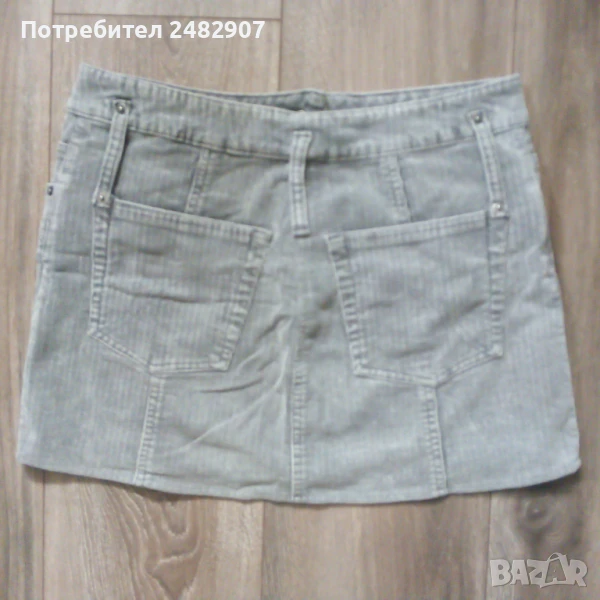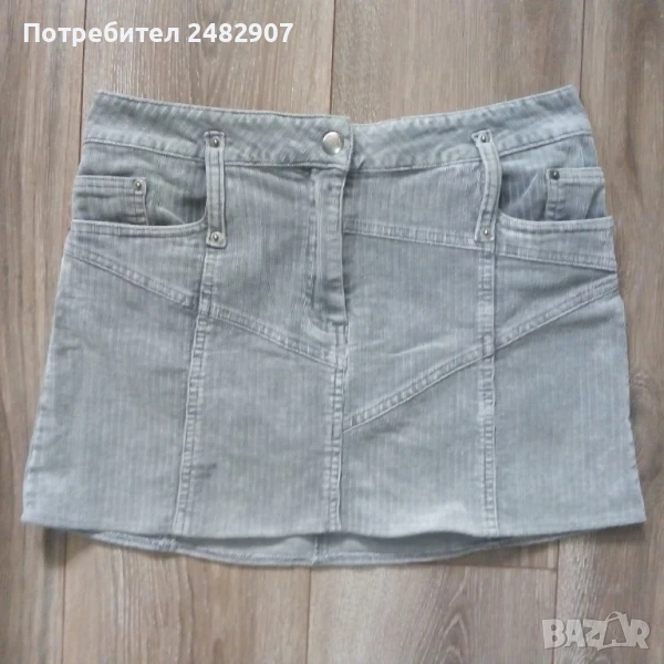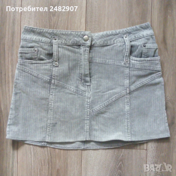 Сива дамска джинсова къса пола VERO MODA, размер S. Ширина в талията - 37 см, ширина в долната част - 48 см, дължина от талията до долу - 33 см. Закопчаване - с цип и копче отпред, широки гайки, джобове отпред и отзад. Много запазена, почти не е използвана.