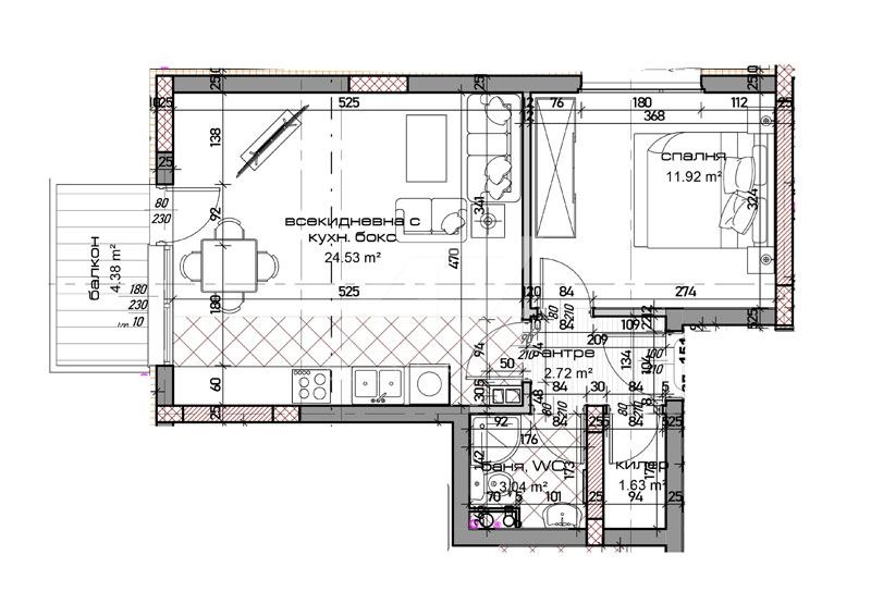 Апартаментът се намира на 2-ри жилищен етаж и се състои от антре, дневна и кухня, спалня, баня и тоалет и тераса