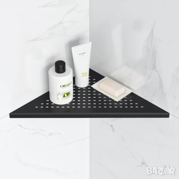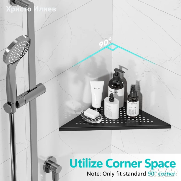 Спестяване на място: Черният рафт за баня 90° е идеален за свободно проектиране на вертикално пространство в ъгъла на стената за съхранение на шампоан и душ гел, което прави банята по-чиста и подредена.