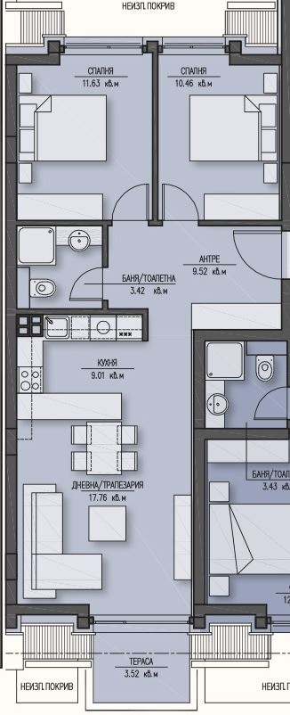 Имотът разполага с площ от 92 кв.м / входно антре, вскидневна с кухненски бокс, две спални помещения, баня с тоалетна и тераса. Намира се на шести етаж.