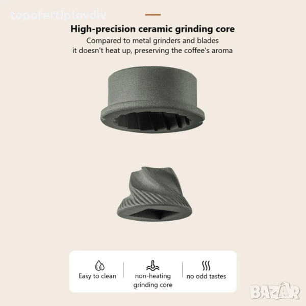 Прецизно керамично смилане: Запазва автентичния аромат на кафените зърна, осигурявайки процес на смилане без топлина, за разлика от металните сърцевини или остриета.