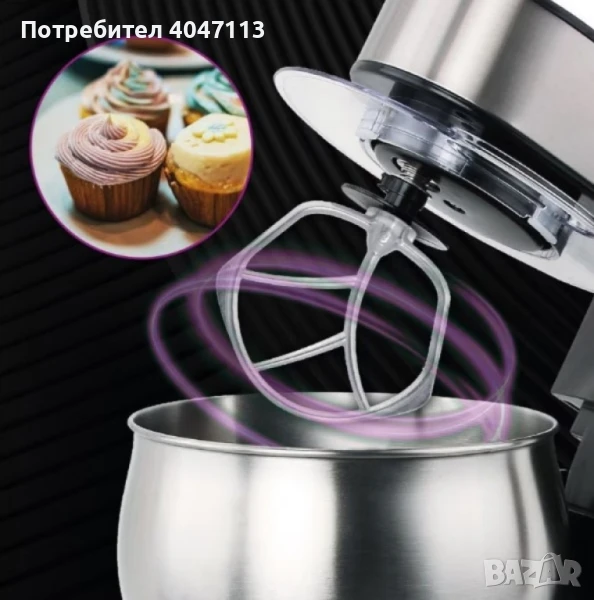 Планетарен миксер Купа от неръждаема стомана с вместимост 5л. Планетарно движение за перфектно смесване Кука за месене, бъркалка, бъркалка (със защита). Прозрачен капак с отвор. Накланящо се рамо за лесен достъп. 6 скорости. Противоплъзгащо краче. Предпазен ключ. Захранване 220-240V~ 50/60Hz Мощност: 1000W; Гаранция: 24 месеца.