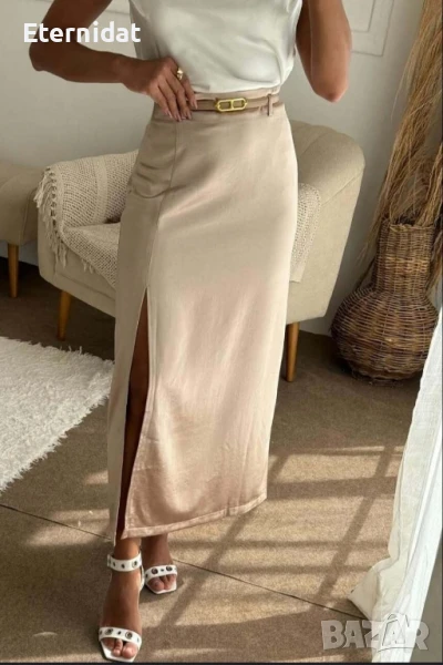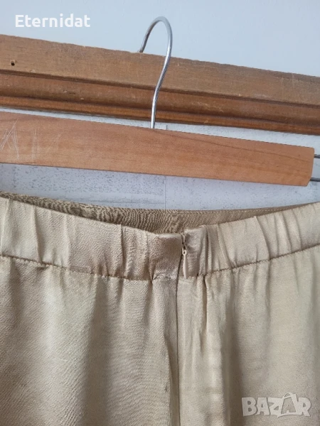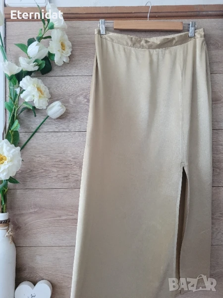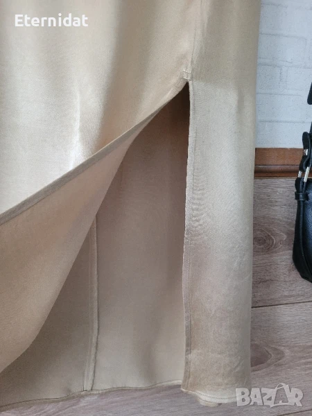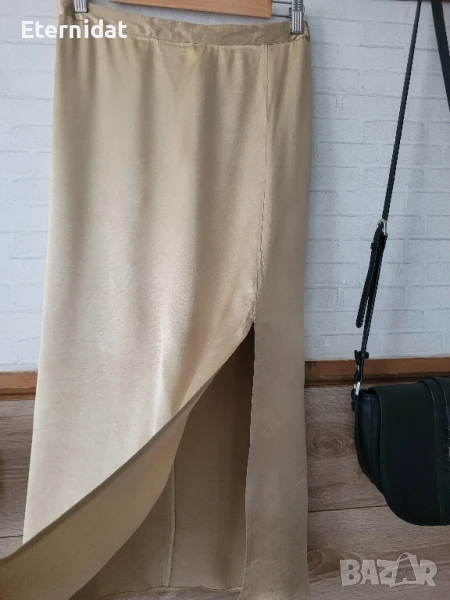 Сатенена пола в златист цвят на марката ENVII. Ластик в талията и закопчаване скрит цип. Една странична цепка. Размер Л. Цена 35лв