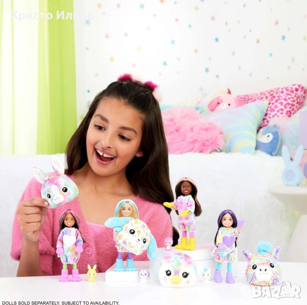 Момичетата могат да намерят зайче, зебра, пингвин или далматинец, преобразени от черно-бяло в дъгово палто. Състав и функционалност: след свалянето на костюма, куклата Chelsea™ също е изненада като рокля и мини животно, които съвпадат с костюма на куклата. Чрез завъртане на плюшения костюм може да се получи oversized палто от главата на костюма, легло за домашния любимец. Студената вода позволява цветна промяна на мини животните, а топлата вода ги връща обратно.