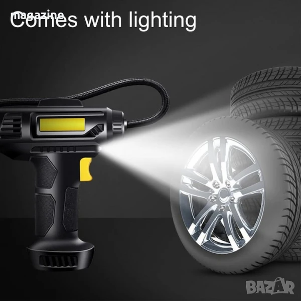 Мощният 72 W мотор осигурява бързо и ефективно помпане на гумите, идеален за спешна употреба или редовна поддръжка на налягането в гумите. Безжично, 7.2V захранване: Компресорът се захранва от 7.2V акумулаторна батерия, елиминирайки нуждата от кабели и предлагайки пълна мобилност. Идеален за използване на път, къмпинг или у дома. Максимално налягане 10,0 бара: С максимално налягане от 10,0 бара, компресорът може да напомпва широка гама автомобилни гуми, велосипеди, топки и друго надуваемо оборудване, предлагайки гъвкавост и производителност. Въздушен капацитет 18 литра/минута: С въздушен капацитет от 18 литра в минута, компресорът осигурява бързо надуване, спестявайки време и усилия. Интегрирано LED осветление: Оборудван с интегрирана LED светлина, компресорът предлага оптимална видимост при условия на слаба светлина или през нощта, улеснявайки употребата във всяка ситуация.Дигитален екран: Лесният за четене дигитален дисплей позволява прецизна настройка и следене на желаното налягане, осигурявайки точно и безопасно помпане на гумите. Лесна работа: Компресорът е лесен за използване, с интуитивни бутони за включване/изключване.