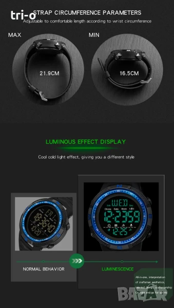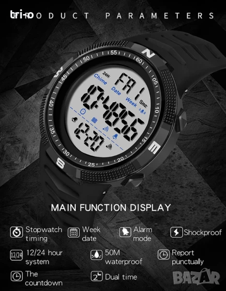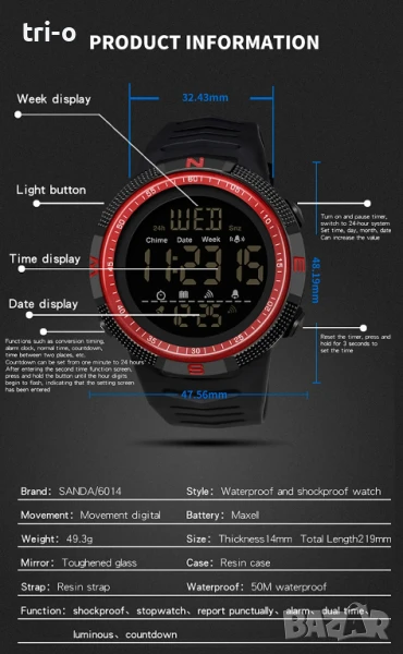 Характеристики: удароустойчив, светещ, автоматичен датчик, водоустойчив, плуване, аларма, хронограф, секундомер. Дълбочина на водоустойчивост: 5 бара.