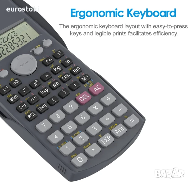 Професионален научен калкулатор с 240 научни функции. Лесно обработва статистически изчисления с 1 и 2 променливи, три режима за ъгли (градуси, радиани и градации) и режими за научна/инженерна нотация.