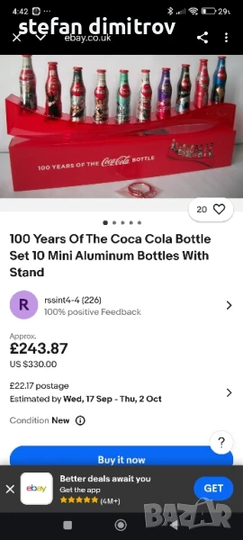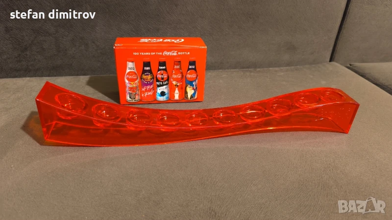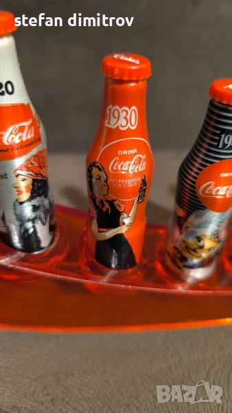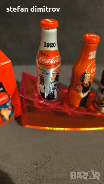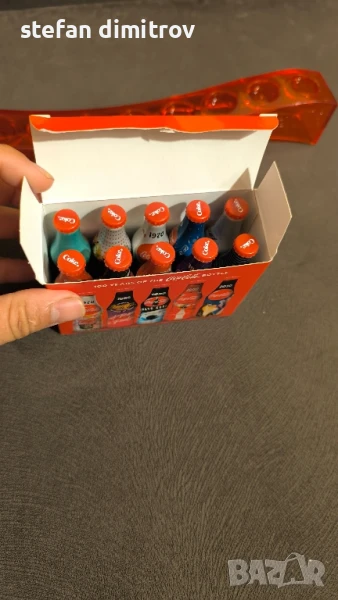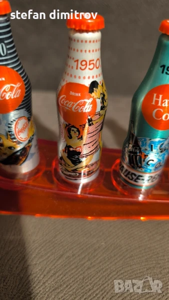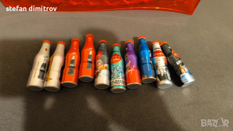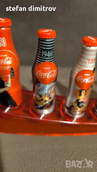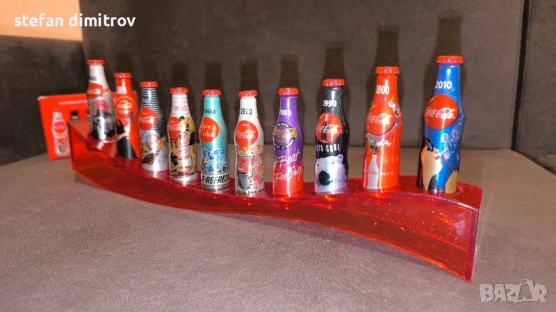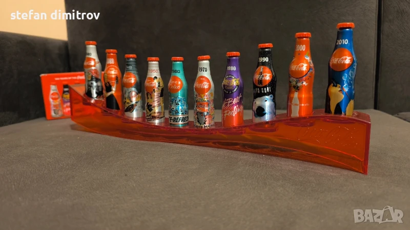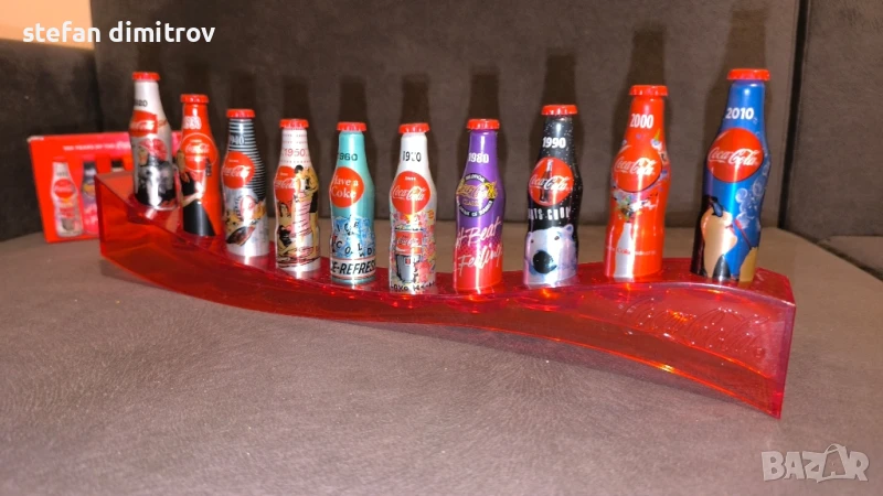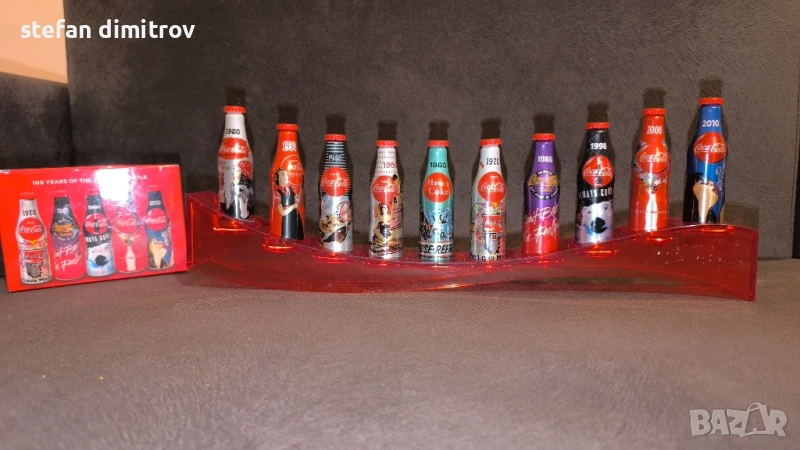 Coca Cola 100 години комплект бутилки, 10 мини алуминиеви бутилки с поставка → Обява 51381112