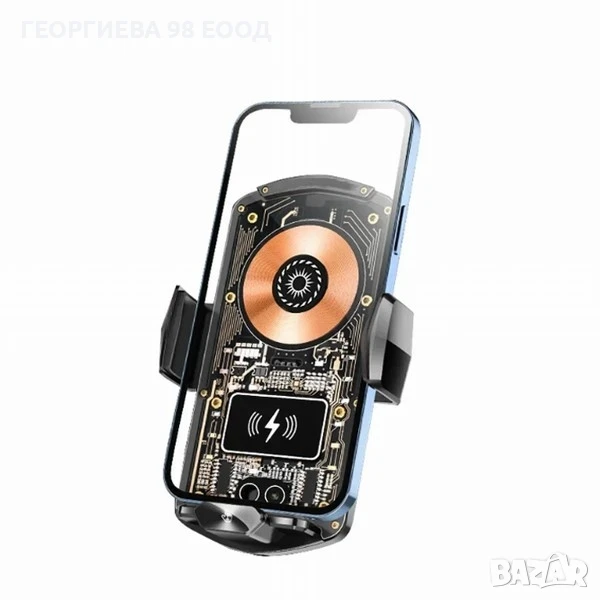 Стойка с безжично зареждане, 1x Вендуза за захващане, 1x Захват за въздуховоди, 1x Кабел за запалката, 3x Преходници (Type C, Micro USB и Lightning).