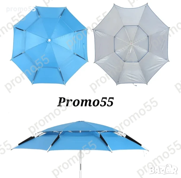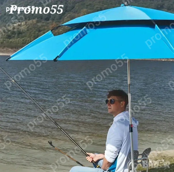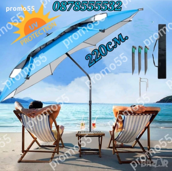 Чадър с УВ защита и чупещо рамо, изключително подходящ за използване на плажа, за къмпинг и риболов.