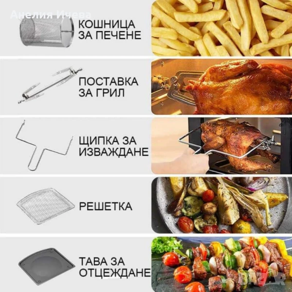 Допълнителни: Въртяща се кошница за пържене, въртящ се шиш – идеален за печено пиле, 2 плъзгащи се решетъчни тави за различни ястия, тава за печене;