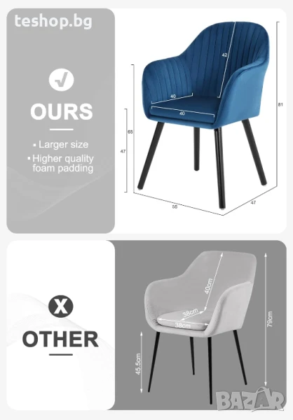 Лесен за сглобяване тапициран стол: Предоставяме ясни, илюстрирани инструкции и номерирани аксесоари, които ще ви помогнат да сглобите бързо. Размери на стола - обща височина: 81 см; височина на седалката: 44 см; седалка: 40 x 40 см; Височина на облегалката: 42 см.