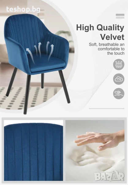 Стабилен фотьойл: Столът има издръжлива кадифена повърхност, подплата от пяна с висока плътност, метална напречна рамка и здрави крака от масивна дървесина. Всичко това допринася за висока стабилност и издръжливост. Максимална статична товароносимост: 150 кг.