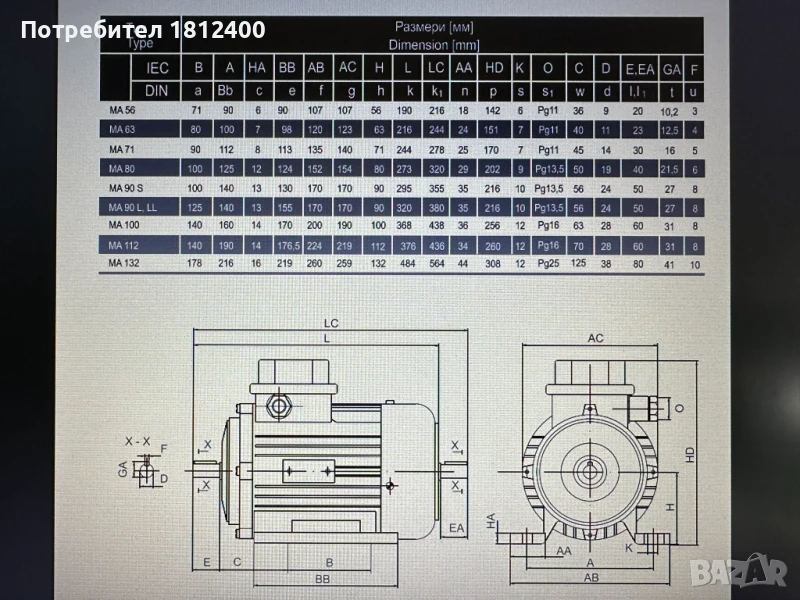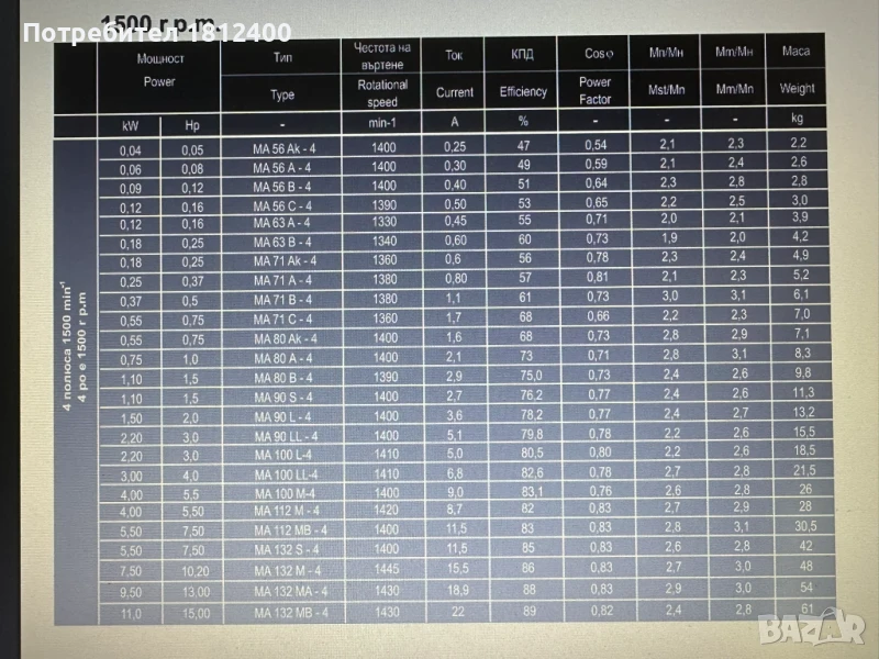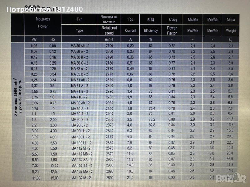 Характеристики на Трифазен електродвигател тип MА :