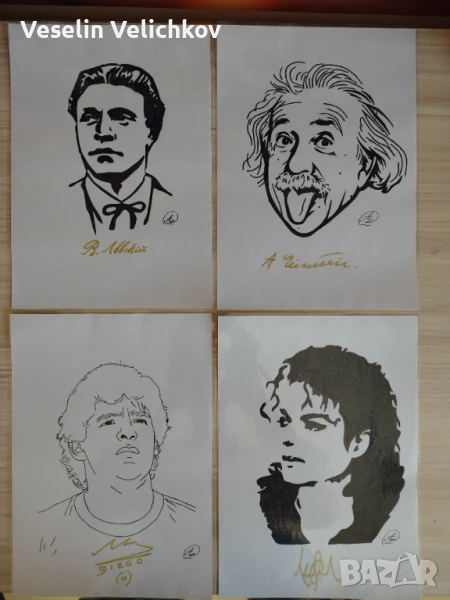 автографи на личностите, които също са направени ръчно от сина ми и са едно към едно с оригиналните. Ламинирани са, за да се запазят във вида, в който изглеждат в момента. Могат да бъдат изработени и личности по ваш избор. Ако някоя от рисунките ви е докоснала и искате да я притежавате или да направите подарък на някого може да си поръчате на цени от 7 лв за брой.