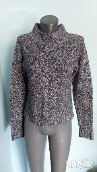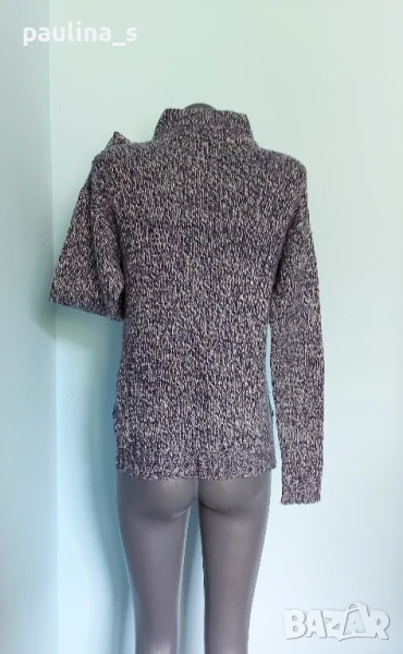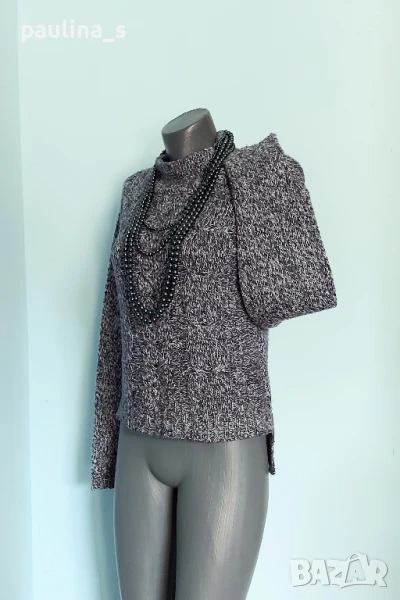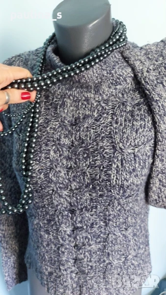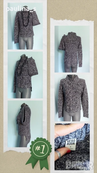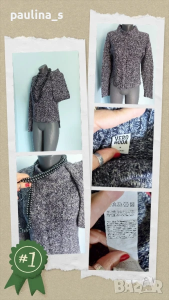 3️⃣. M / XL - "Vero Moda". Цената е крайна 19,99лв / 10 евро. Меланжен пуловер тип туника с издължена задна част, падащи рамене, високо бие полуполо. Преждата е меланж тъмно синя и бяла, декорациите са от плетеници, мека и приятна за допир до кожата, пухкава. Без дефекти.