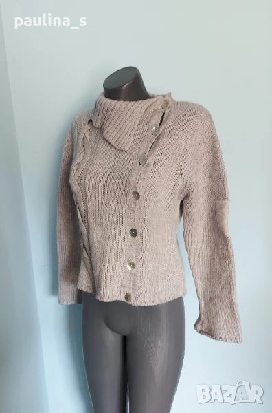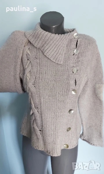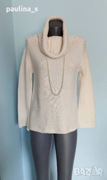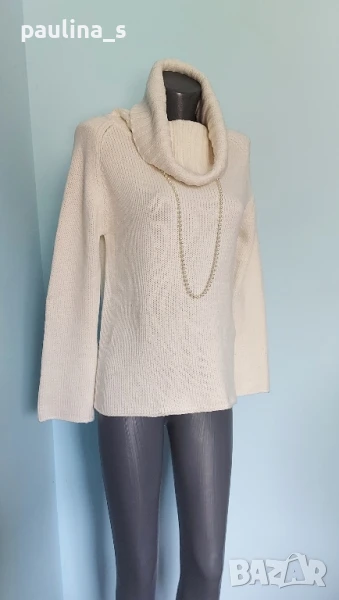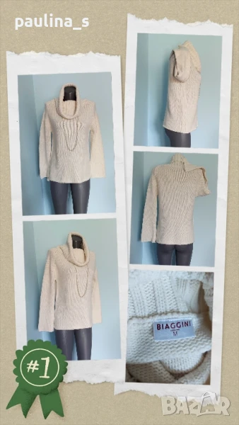 2️⃣. Колаж / M / XL - "Biaggini". Цената е крайна 24,99лв / 12,5 евро. ВИНТИДЖ 2004г. Като нов! Брандът е елитен, но не съществува вече. Топъл дамски пуловер с богата поло яка. Цветът е между Бял и Слонова кост. Моделът е изчистен с реглан ръкав(започва от бието), втален силует и фуния ръкави. Уникален. Преждата е памук и полиестер, има еластичност от плетивото до 2XL, без дефекти и етикет. Герданът е нов - 2 евро и не влиза в цената, предпочитам да не се делят.