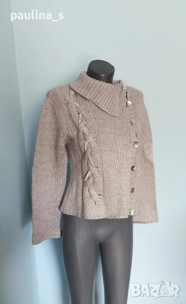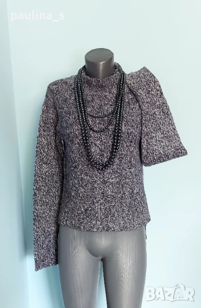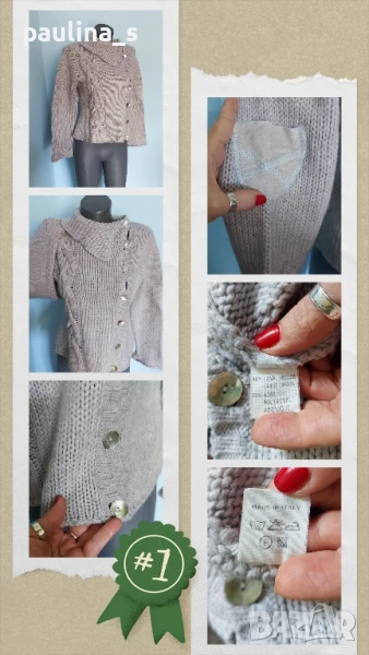 1️⃣. Колаж / M / XL - ВИНТИДЖ! Италиански пуловер, кроп модел с фуния ръкави. Цената е крайна 29,99лв / 15 евро. Предната част е с плетеница, в която е вплетена велурена лента, копчетата са от естествен седеф - Абалон, което допълва дрехата в уникална хармония. Преждата е вълна и примеси. Асиметрична яка, сивкав цвят. Гъделичка сетивата! Само копчетата са на по-висока цена в кинкалерията.