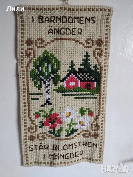 Красива ръчно бродирана стена „В Барндоменс Енгдер цъфти в изобилие“ . Размери 50/30 см. Изпращам по Еконт.
