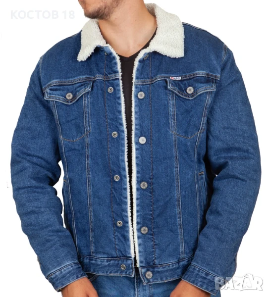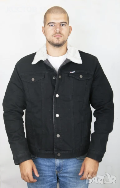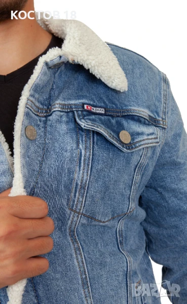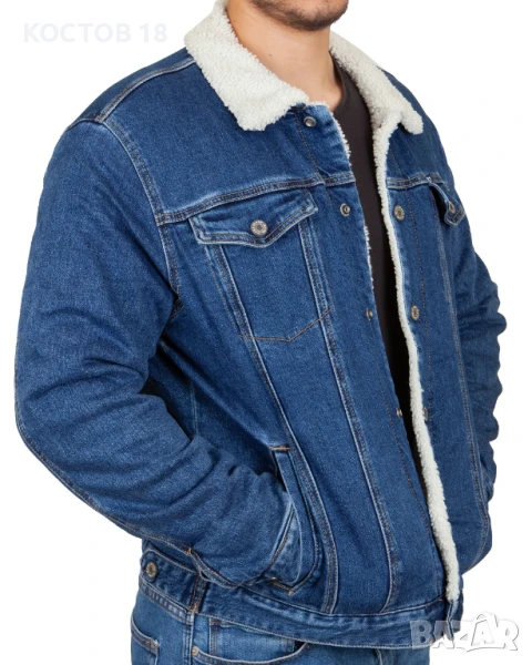 Мъжко дънково яке с копчета, Разполага с мека и топла подплата, излючително подходящо за по-хладните дни. Подходящо за ежедневно носене, спорт, туризъм и др. Два странични джоба. Две горни джобчета с капаче и с по едно копчета.Закопчаване на ръкавите с копчета