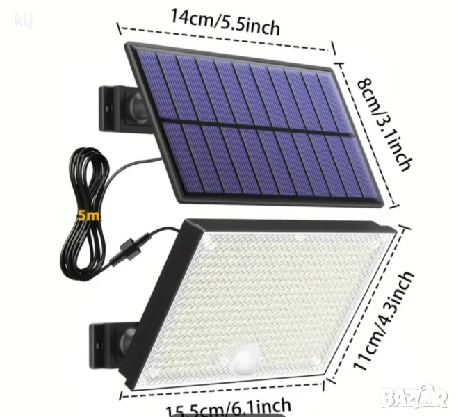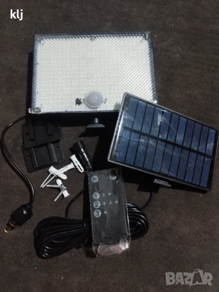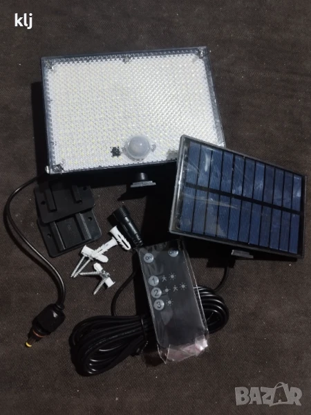 Външна соларна лампа с 400 леда и датчик за движение, дистанционно управление,кабел 5 метра, осветление от залез до изгрев.последните 5 снимки са реално осветяване на прожектора, определено е мощен
