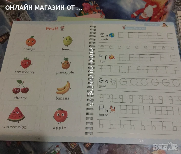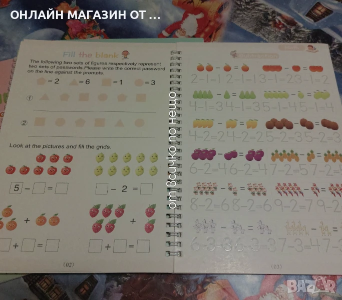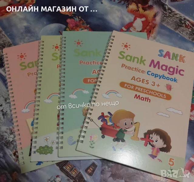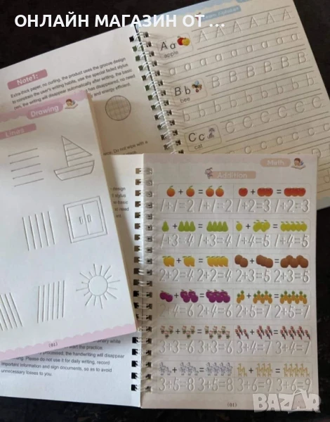 Комплект от 4 броя образователни детски тетрадки с различна тематика - за учене на английските буквите, цифрите, математика и рисуване.