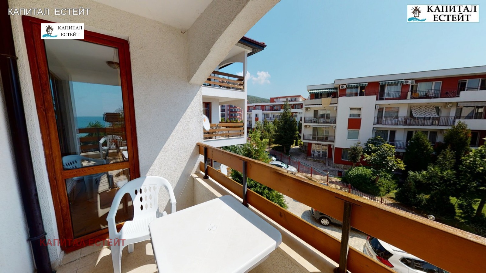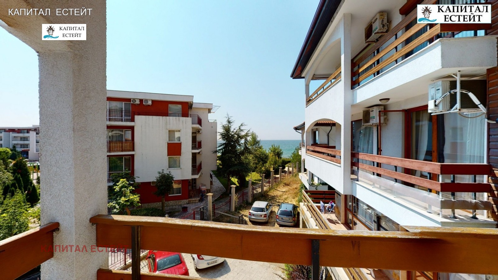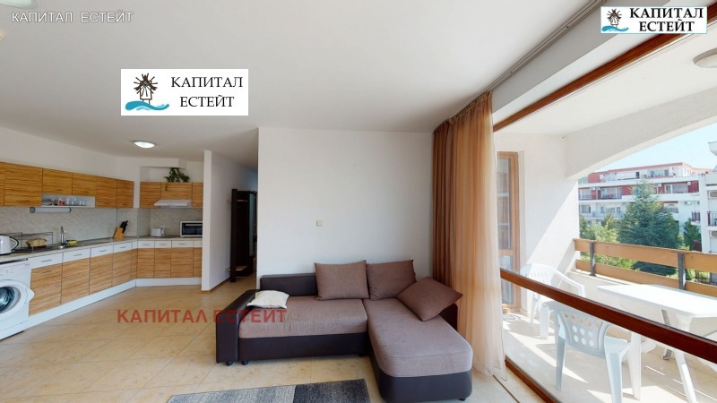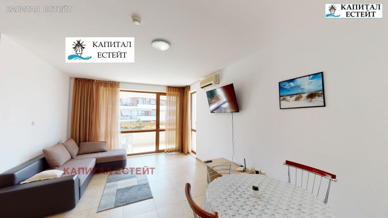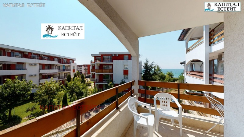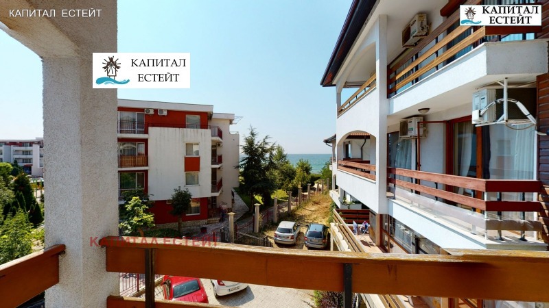 Представяме на Вашето внимание новото ни предложение за покупка на отличен ваканционен апартамент (обща площ 89,71 кв.м., застроена 82,07 кв.м.) в Робинзон Бийч, к.к.Елените. Преимущество на описвания 3-стаен апартамент е топ локацията на комплекса на първа линия море. Предлаганият от нас апартамент е разположен на етаж 2-ри етаж над партера (трети на сградата) и се състои се от: дневна с кухненски бокс, две спални, две бани с тоалетна, просторна тераса с гледка море, на която има излаз от дневната и едната спалня! Изложение на имота изток. Подови настилки и стенно покритие: под - ламинат; стени - латекс. Бани и тоалетни - теракота и фаянс, напълно завършени и оборудвани със санитарна керамика. Жилището се продава напълно обзаведено и готово за експлоатация, както се вижда в галерията към офертата. Разполага с кабелна телевизия и интернет. Снабден и ток, вода и канализация. Имотът е подходящ и за отдаване под наем. Архитектурата на комплекса е съобразена с вида на традиционните къщи от Българското възраждане. Сградата е завършена под формата на буквата 'Г' и се състои от 4 самостоятелни къщи, 7 жилищни входа (на всеки етаж има по два или три апартамента). Повечето жилища разкриват прекрасна панорамна гледка към морето и залива на Слънчев бряг. Тухлената сграда е завършена с хидро- и топлоизолация на покрива и фасадата, добре поддържани общи части със стълбища с под (гранитогрес/теракота) и стени с латекс, метални парапети и асансьор във всеки вход.