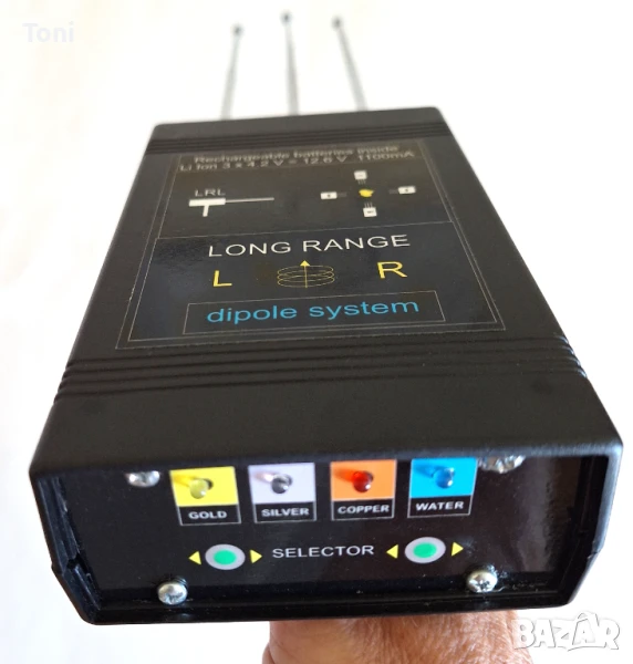 model: VECTOR - 4 .The type of metal to search for can be selected from front panel. .Types of metals are available for searching : gold, silver, copper, and water. The chosen metal is indicated via a light indicator. The device will detect only the chosen metal and nothing else. The operator holds the device in his hand by the isolated handle with a little tilt forward and walks slolwy.