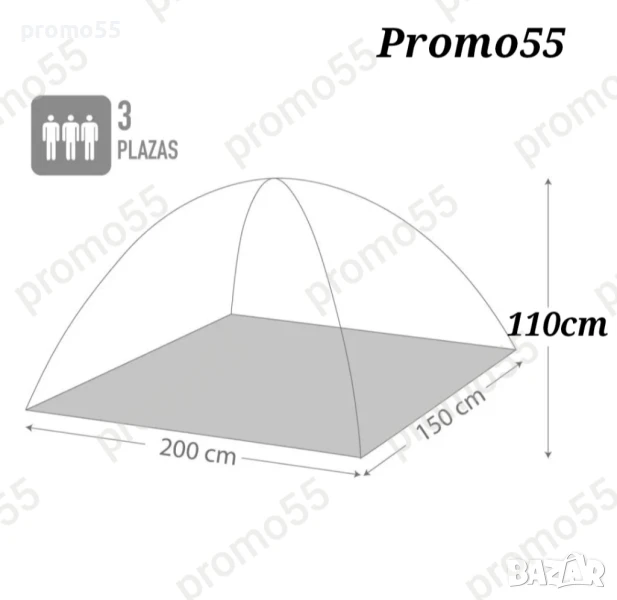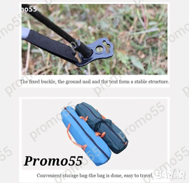 Къмпинг Палатката е с 1 вход, 1 прозорец, комарници, затваряне с цип, рамки от фибростъкло 5мм., колчета за заземяване от неръждаема стомана и шнурове за издърпване за защита, транспортна чанта за съхранение.