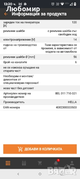 генератор HELLA с номер 8EL 011 710-321 за SKODA OCTAVIA I (1U2) 1.8 T