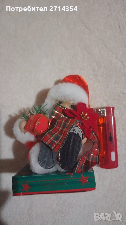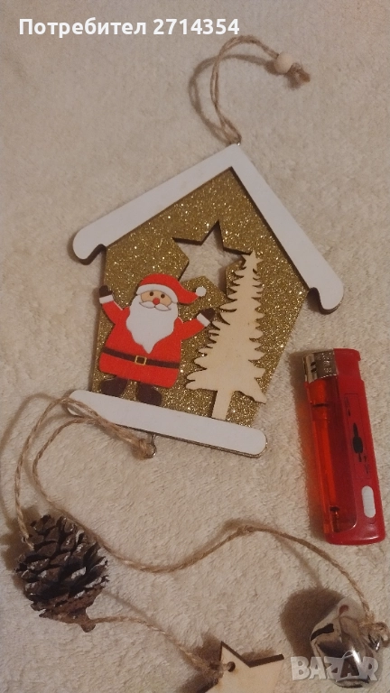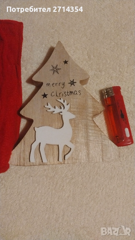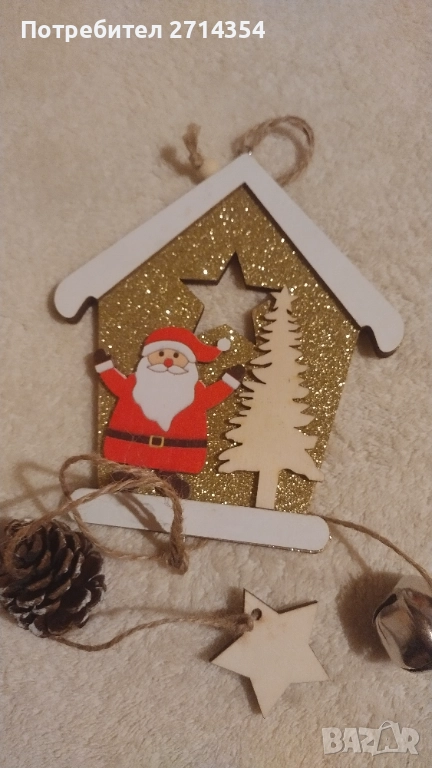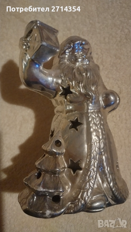 дървена елхичка с елени и торбичка цена 6 лева, красива сребриста фигура дядо коледа с поставка за свещ 10 лева,