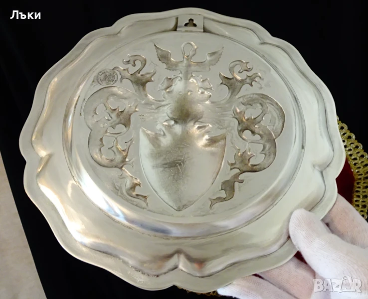 изработка от 95% калай и 5% сребро,маркирана от производителя.Декорирана с