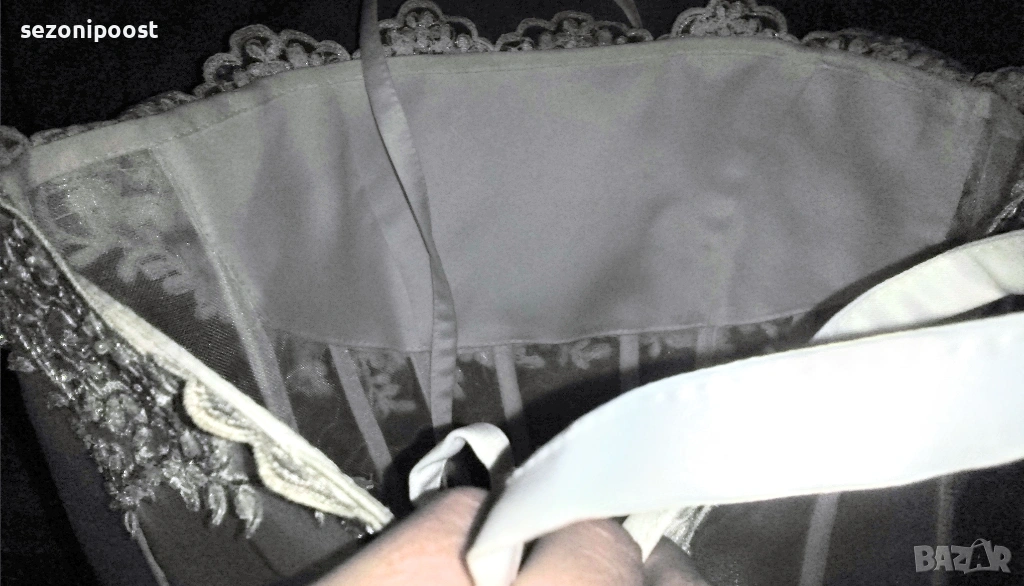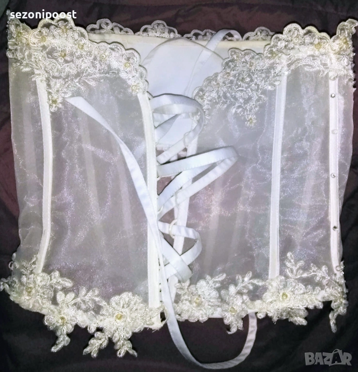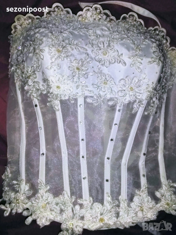 Корсета е за официални поводи или вечери. Цвета основно е бял с малки бели жълти дребни камъчета на бюста. В добро състояние с нормални следи от употреба,цената е съобразена .Задната му част е на връзки, втален модел е стои страхотно по тялото в зависимост от стягането, подходящ е за размерите С, М и Л. С вградени подплънки на бюста. При интерес ще дам още снимки.