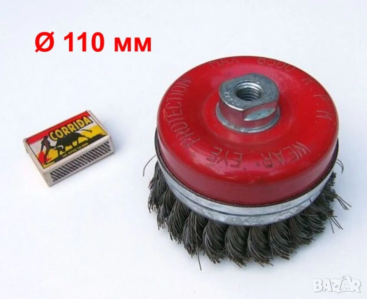 №1: ЧЕТКА тип камбана; Диаметър: Ø110 мм; Отвор: М14x2; Двустен: 24 мм; Тегло: ~900 грама; Цена: € 4,90; 1 бр.(Нов; Италия); ЧЕТКА тип камбана (усилена плетена) - монтира се директно на ъглошлайфи и шмиргели с работен шпиндел вал ос с резба М14.