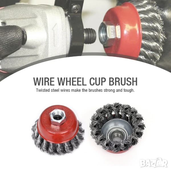 Многоцелеви от стоманена тел - за почистване отстраняване на ръжда, налепи, шлака, чеплъци, боя, лепило и др., заглаждане на грапавини ръбове заваръчни шевове, за полиране и финна обработка на метали и неметали.